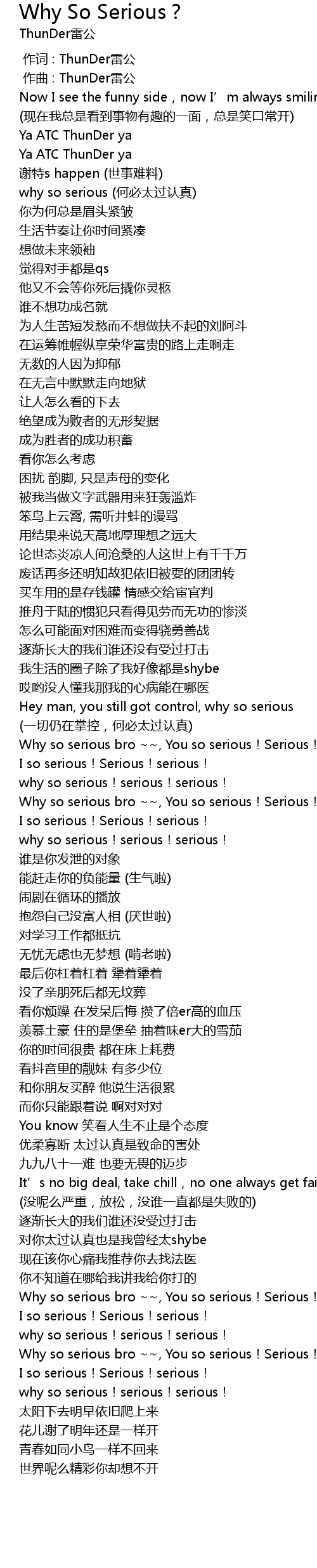 | [02:43.203] | Why so serious bro , You so serious! Serious! serious! |