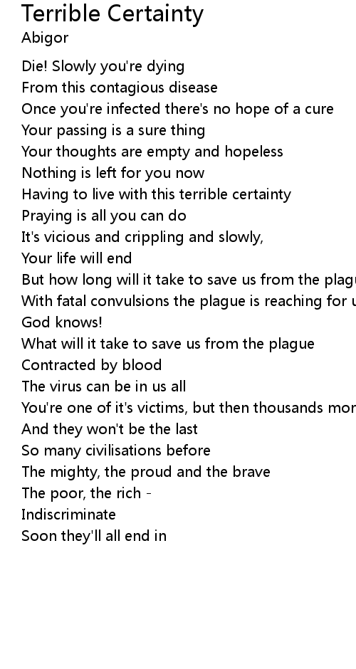 | Having to live with this terrible certainty | |
