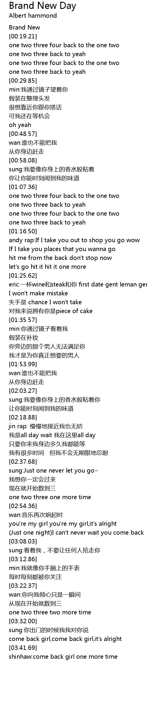 | [02:24.20] | wo shi all day wait wo zai zhe li all day |