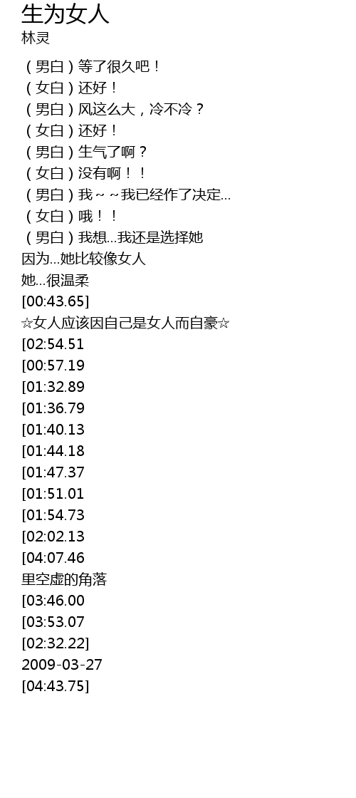 | [04:14.76][03:46.00][02:16.27] | 生为女人 难道也是罪过 |