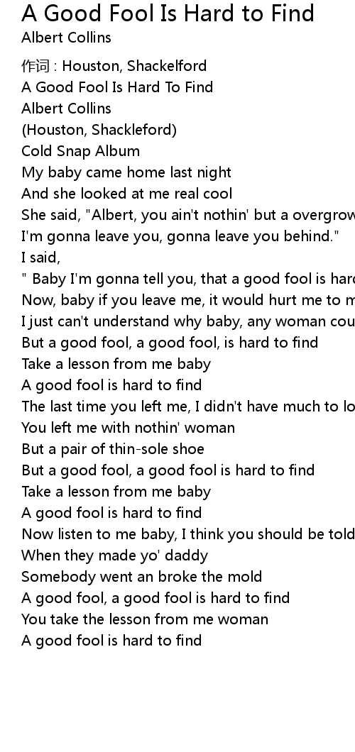 | " Baby I' m gonna tell you, that a good fool is hard to find." | |