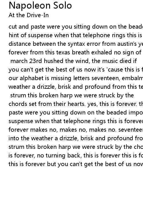 cut and paste were you sitting down on the beaded impotence of new orleans? a hint of suspense when that telephone rings this is forever it paved a wave of distance between the syntax error from austin's yellow brick road this is forever from this texas breath exhaled no sign of relief this you know, this you know, this is forever [chorus x2] march 23rd hushed the wind, the music died if you can't get the best of us now it's 'cause this is forever makes no difference our alphabet is missing letters seventeen, embalmed and caskets lowered into the weather a drizzle, brisk and profound from this texas breath exhaled no sign of relief this is forever [chorus x2] strum this broken harp we were struck by the chords set from their hearts. yes, this is forever. this is forever cut and paste were you sitting down on the beaded impotence of new orleans? a hint of suspense when that telephone rings this is forever this is forever this is forever makes no, makes no, makes no. seventeen, embalmed and caskets lowered into the weather a drizzle, brisk and profound from this texas breath exhaled strum this broken harp we were struck by the chords set from their hearts this is forever, no turning back, this is forever this is forever, no turning back, this is forever but you can't get the best of us now... |
