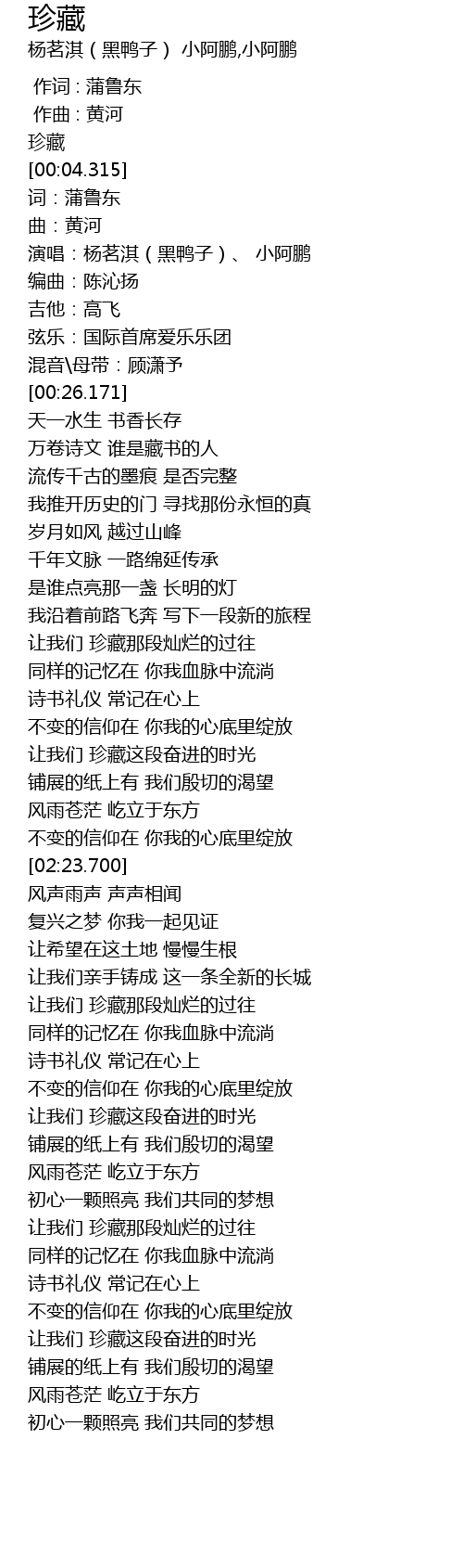 | [00:14.044] | 演唱:杨茗淇(黑鸭子)、 小阿鹏 |