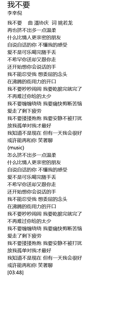 | [00:00] | 我不要 曲 潘协庆 词 姚若龙 |