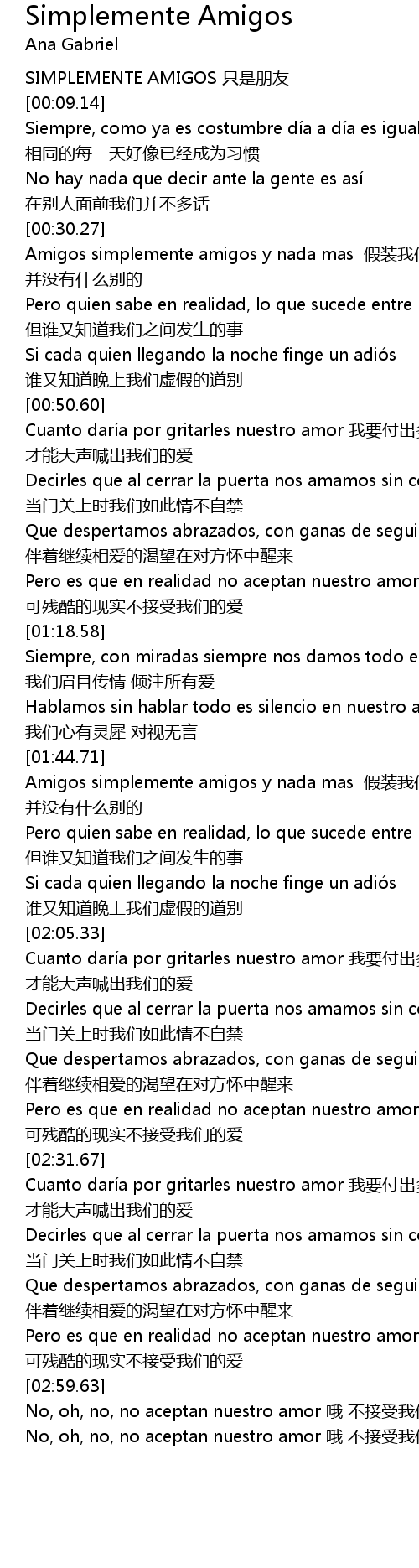 | [01:45.65] | Amigos simplemente amigos y nada mas 假装我们只是朋友 并没有什么别的 |