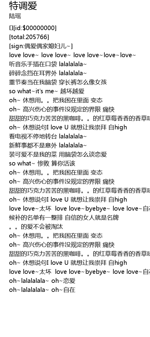 | [02:56.285] | love love tai huai love love byebye love love zi zai love love |