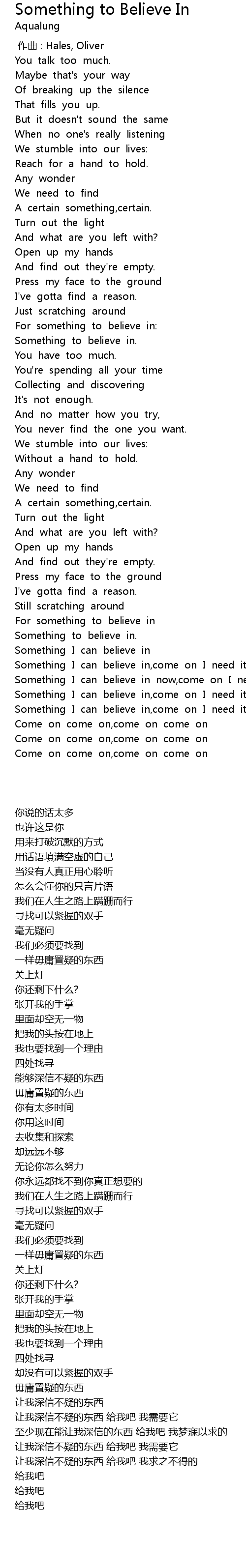 | [02:55.416] | Something I can believe in now,come on I need it |