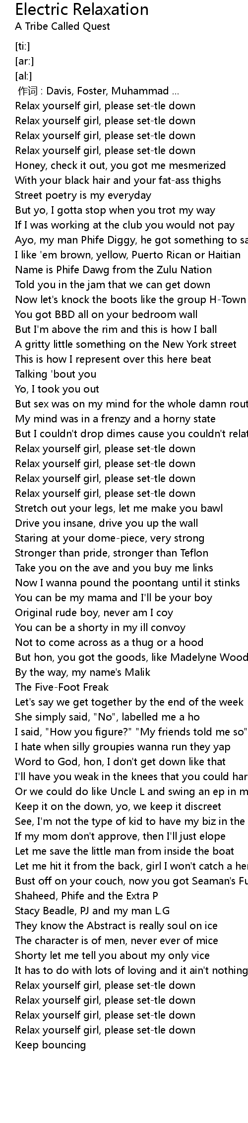 | [00:19.61] | Relax yourself girl, please set-tle down |