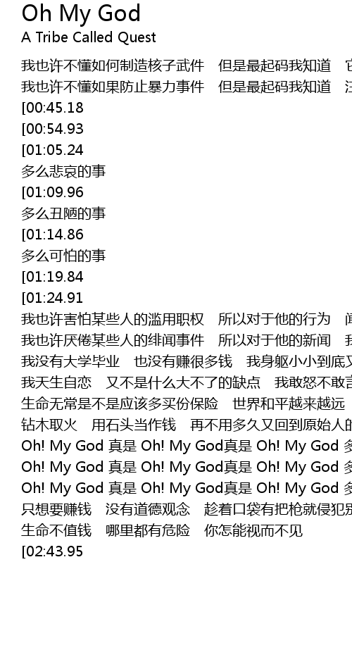 | [02:18.47][01:05.24] | Oh! My God 真是 Oh! My God真是 Oh! My God 多么悲哀的事 |