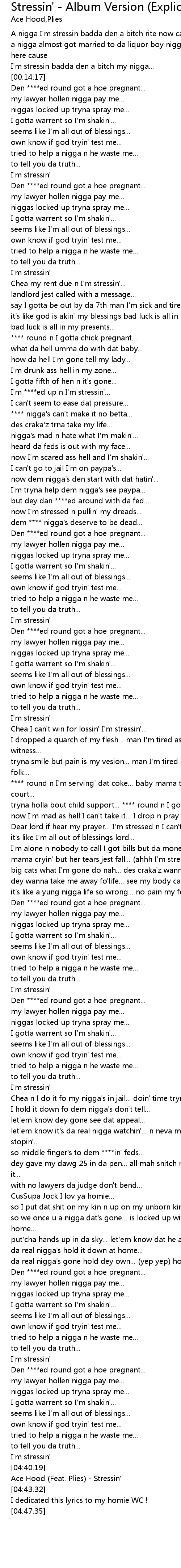 | [01:08.29] | I'm ****ed up n I'm stressin'... |