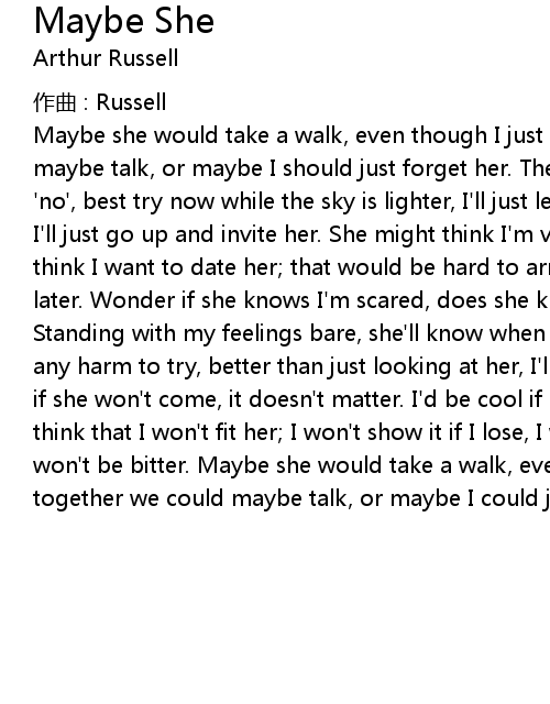 | Maybe she would take a walk, even though I just have met her. together we could maybe talk, or maybe I should just forget her. The only thing she could say is ' no', best try now while the sky is lighter, I' ll just let my feelings show, I' ll just go up and invite her. She might think I' m very strange, she might think I want to date her that would be hard to arrange, maybe I should ask her later. Wonder if she knows I' m scared, does she know I' m glad to meet her? Standing with my feelings bare, she' ll know when I start to greet her. Won' t do any harm to try, better than just looking at her, I' ll just look into her eyes, if she won' t come, it doesn' t matter. I' d be cool if she refused, she might think that I won' t fit her I won' t show it if I lose, I won' t be sad and I won' t be bitter. Maybe she would take a walk, even though I just have met her together we could maybe talk, or maybe I could just forget her |