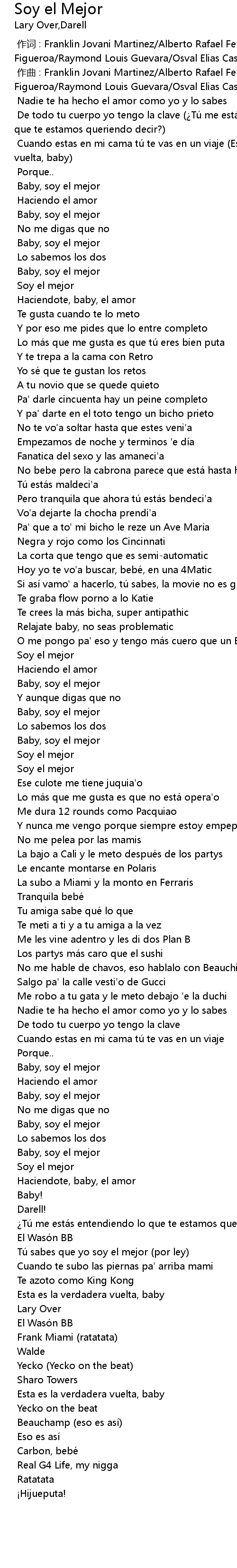 | [00:04.877] | De todo tu cuerpo yo tengo la clave Tú me está s entendiendo lo que te estamos queriendo decir? |