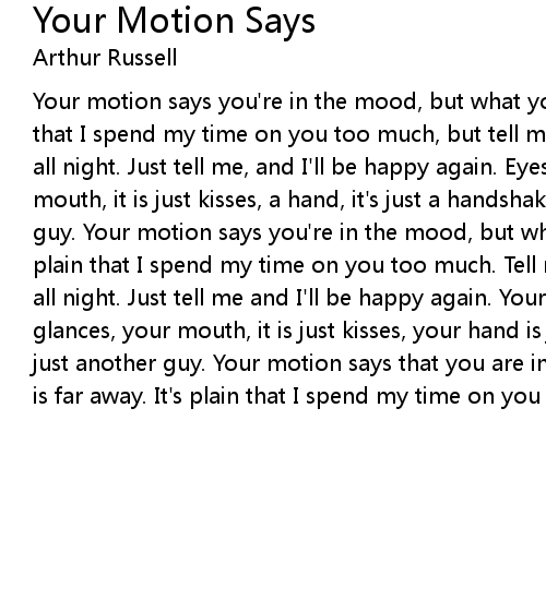 Your motion says you're in the mood, but what you want is far away. It's plain that I spend my time on you too much, but tell me it's alright, and I can laugh all night. Just tell me, and I'll be happy again. Eyes, they are just glances, a mouth, it is just kisses, a hand, it's just a handshake, and I am just another guy. Your motion says you're in the mood, but what you want is far away. It's plain that I spend my time on you too much. Tell me it's alright, and I can last all night. Just tell me and I'll be happy again. Your eyes, they are just glances, your mouth, it is just kisses, your hand is just a handshake, and I am just another guy. Your motion says that you are in the mood, but what you want is far away. It's plain that I spend my time on you too much |
