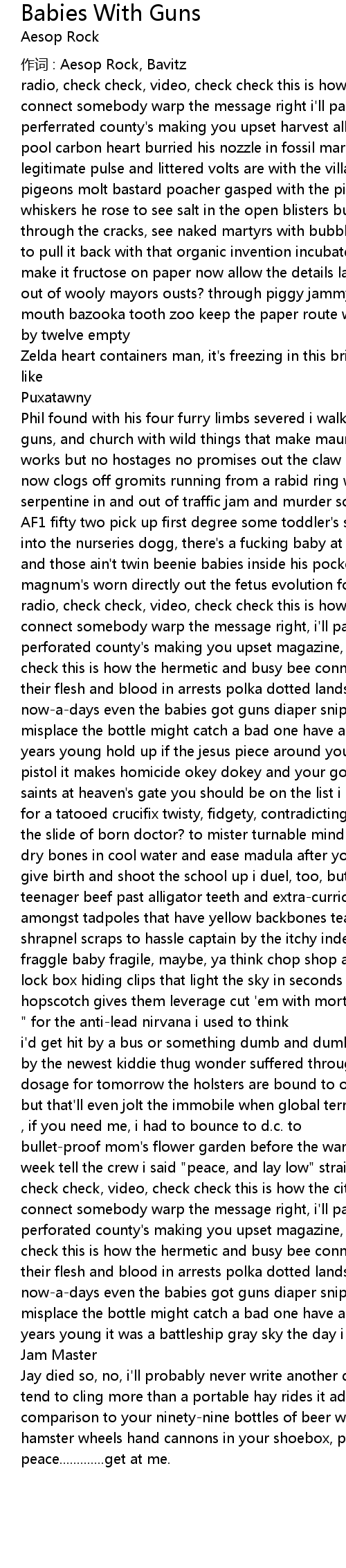 | AF1 fifty two pick up first degree some toddler' s smuggled tommy guns and crack into the nurseries dogg, there' s a fucking baby at the door asking for wallets and those ain' t twin beenie babies inside his pockets 2010 sonograms show the magnum' s worn directly out the fetus evolution for the young killer convenience radio, check check, video, check check this is how the city folk and mole people connect somebody warp the message right, i' ll pass it to the next now the perforated county' s making you upset magazine, check check, paper route, check check this is how the hermetic and busy bee connect somebody' s losing track of their flesh and blood in arrests polka dotted landscapes what did you expect? nowadays even the babies got guns diaper snipers having clocktower fun misplace the bottle might catch a bad one have a midlife crisis when you' re ten years young hold up if the jesus piece around your neck is bigger than your pistol it makes homicide okey dokey and your god will forgive you just show the saints at heaven' s gate you should be on the list i hear overlooks manslaughter for a tatooed crucifix twisty, fidgety, contradicting wild animal shit bleed off the slide of born doctor? to mister turnable mind bought? somewhere to laminate dry bones in cool water and ease madula after you thumb sucking diaper chains give birth and shoot the school up i duel, too, but only to exploit no brainers teenager beef past alligator teeth and extracurricular flagpole scrappin' amongst tadpoles that have yellow backbones team mechanism brought airborn shrapnel scraps to hassle captain by the itchy index of an umbilically garped fraggle baby fragile, maybe, ya think chop shop and a misled maladjusty crusty lock box hiding clips that light the sky in seconds like dueling communal hopscotch gives them leverage cut ' em with mortars while i mumble in the immortal slang of " mustnot sleep" for the antilead nirvana i used to think i' d get hit by a bus or something dumb and dumber now the bus is slugs plugged by the newest kiddie thug wonder suffered through kingsley rep a wide pride dosage for tomorrow the holsters are bound to outnumber the roaches not a coach, but that' ll even jolt the immobile when global terrorism' s all the rage your folk get smoked local block head, if you need me, i had to bounce to d. c. to bulletproof mom' s flower garden before the war cheats me if i' m not back in a week tell the crew i said " peace, and lay low" strains don' t vacate slow radio, check check, video, check check this is how the city folk and mole people connect somebody warp the message right, i' ll pass it to the next now the perforated county' s making you upset magazine, check check, news flash, check check this is how the hermetic and busy bee connect somebody' s losing track of their flesh and blood in arrests polka dotted landscapes what did you expect? nowadays even the babies got guns diaper snipers having clocktower fun misplace the bottle might catch a bad one have a midlife crisis when you' re ten years young it was a battleship gray sky the day i got the phone call | |