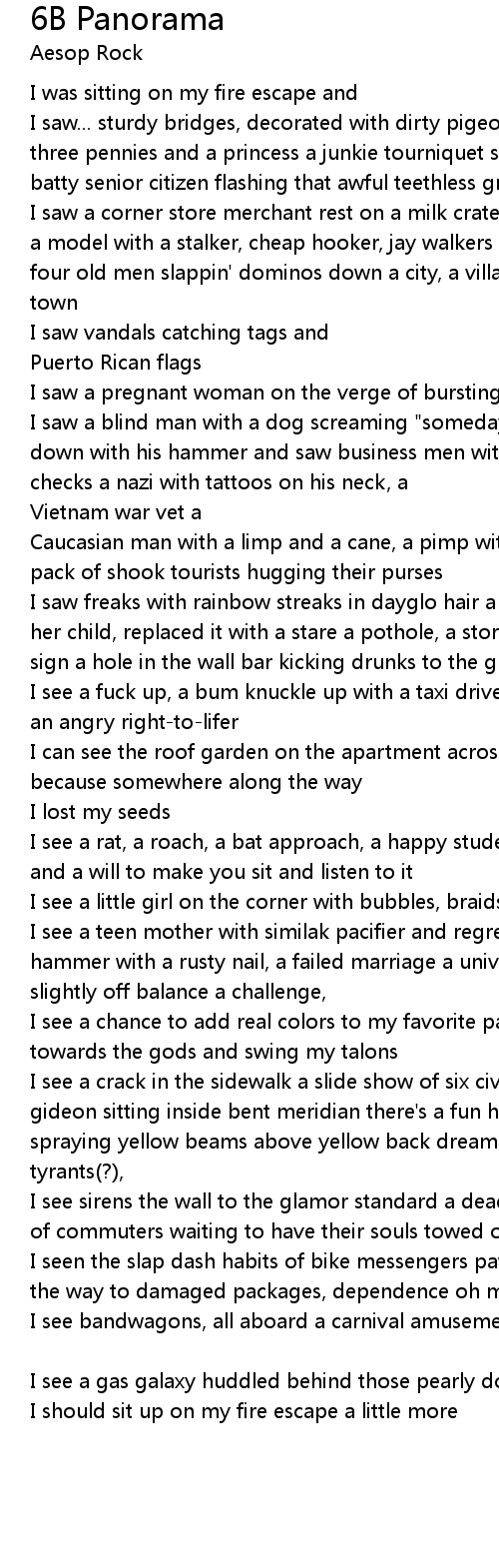 I see a crack in the sidewalk a slide show of six civilians gripping bottles of gideon sitting inside bent meridian there's a fun house ooh, a sun spout spraying yellow beams above yellow back dreams and children in the hydrants tyrants(?), |