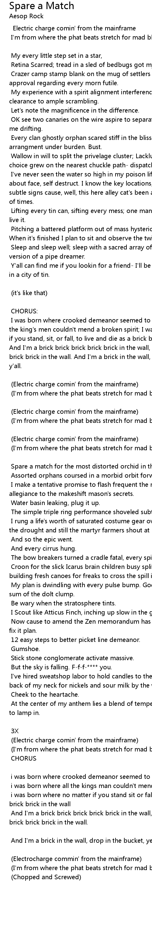 I was born where crooked demeanor seemed to spawn merit; I was born where all the king's men couldn't mend a broken spirit; I was born where it don't matter if you stand, sit, or fall, to live and die as a brick brick brick in the wall. And I'm a brick brick brick brick brick in the wall, and I'm a brick brick brick brick brick in the wall. And I'm a brick in the wall, drop in the bucket, yes y'all. |