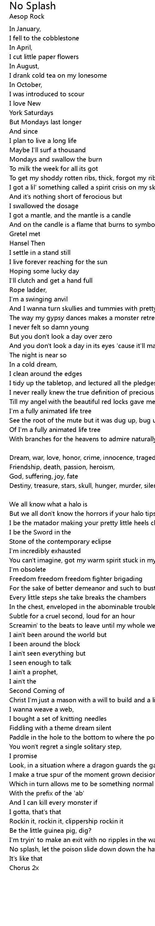 Health, pain, space, breath, sound, guilt, pride, time [Aesop Rock] |