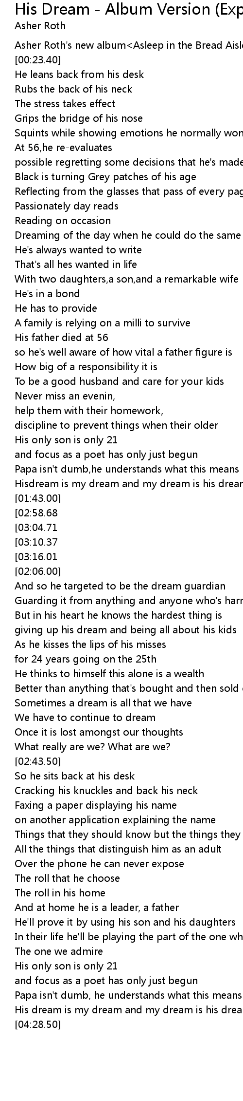 | [00:20.00] | Asher Roth' s new album Asleep in the Bread Aisle |