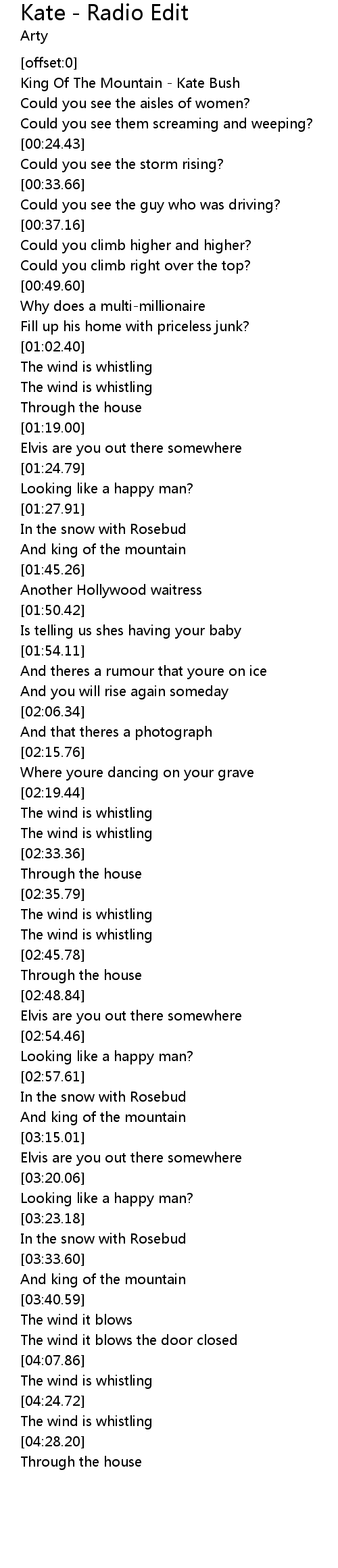 | [00:04.28] | King Of The Mountain - Kate Bush |