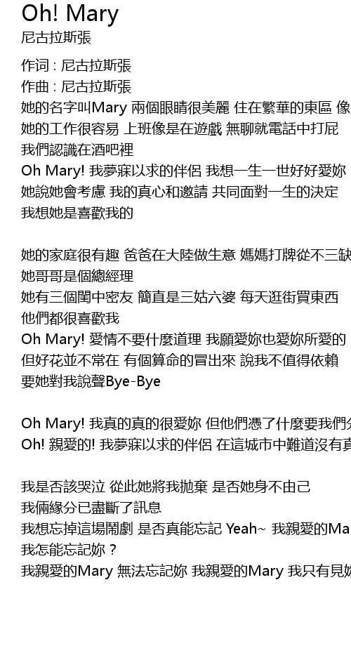 | Oh Mary! wǒ zhēn dí zhēn de hěn ài nǎi dàn tā men píng le shén me yào wǒ men fēn lí Yeah | |