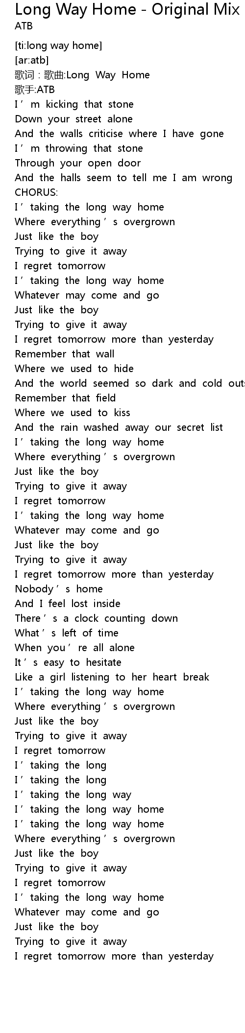 | [00:01.670] | 歌词:歌曲:Long Way Home |
