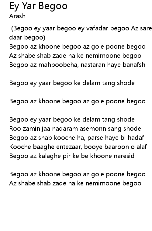 | Az shabe shab zade ha ke nemimoone begoo [Arash:] | |