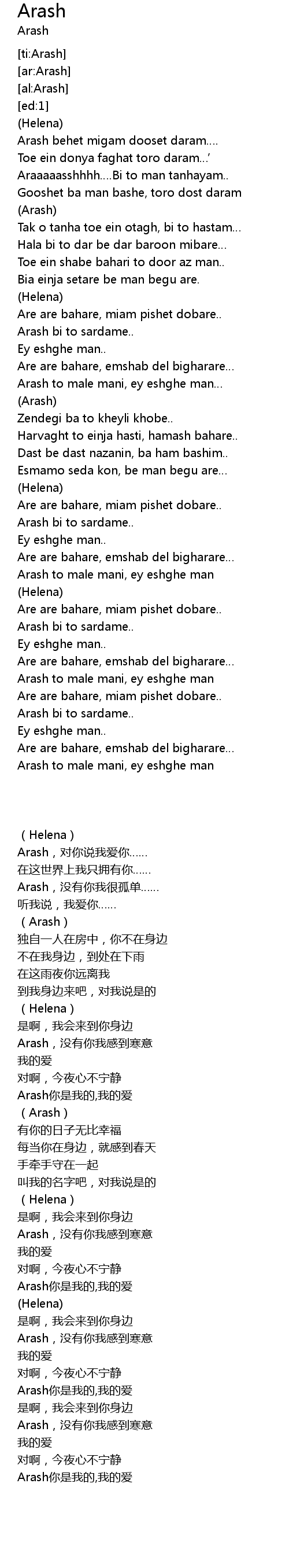 | [01:58.530] | Arash to male mani, ey eshghe man |
