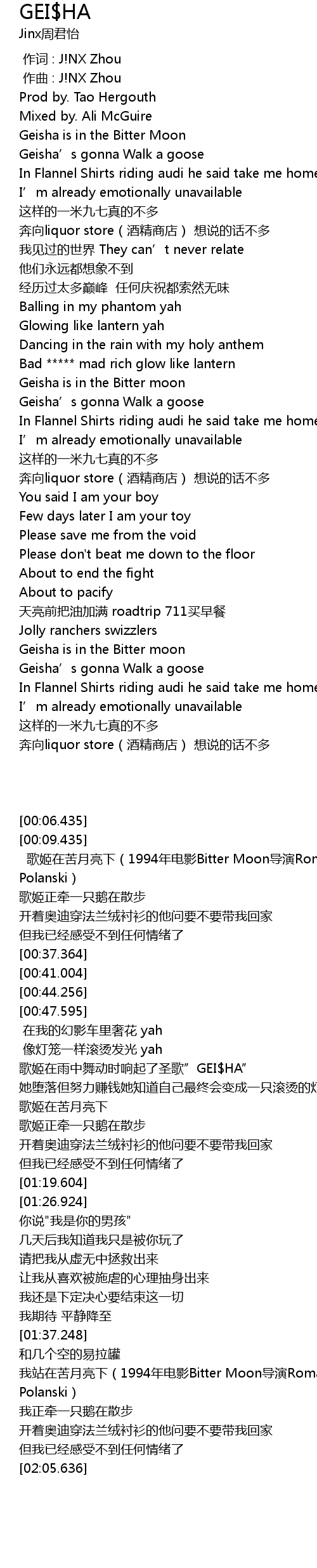 | [00:15.212] | Geisha is in the Bitter Moon |