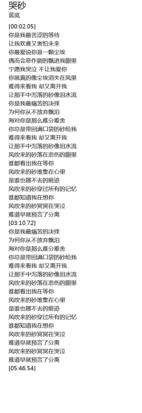 | [02:04.91] | 风吹来的砂落在悲伤的眼里 |