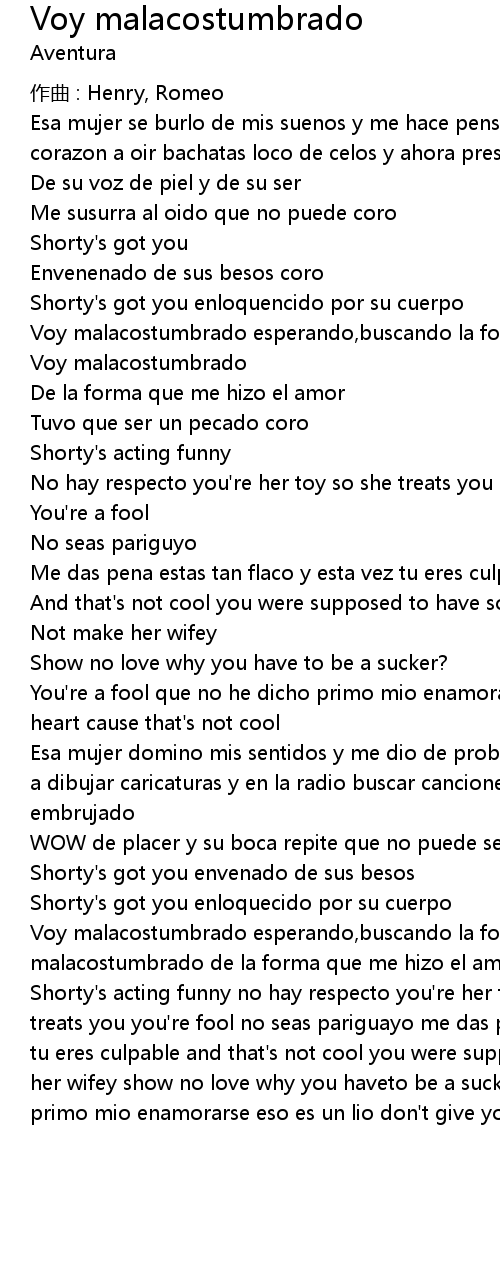 | Voy malacostumbrado esperando,buscando la forma de quedarme a su lado voy malacostumbrado de la forma que me hizo el amor tuvo que ser un pecado | |
