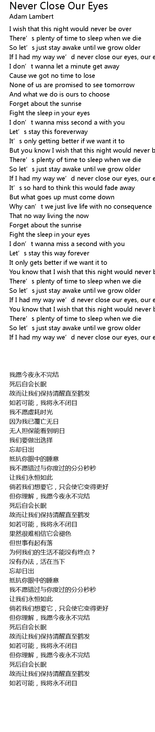 | [01:36.73] | If I had my way we’d never close our eyes, our eyes, never! |