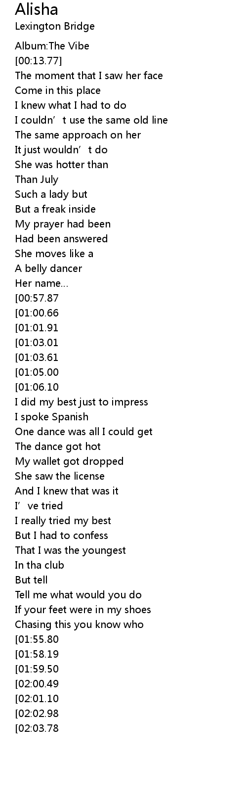 | [01:46.12][01:55.80][02:38.87][02:48.74] | Her name was Alisha |
