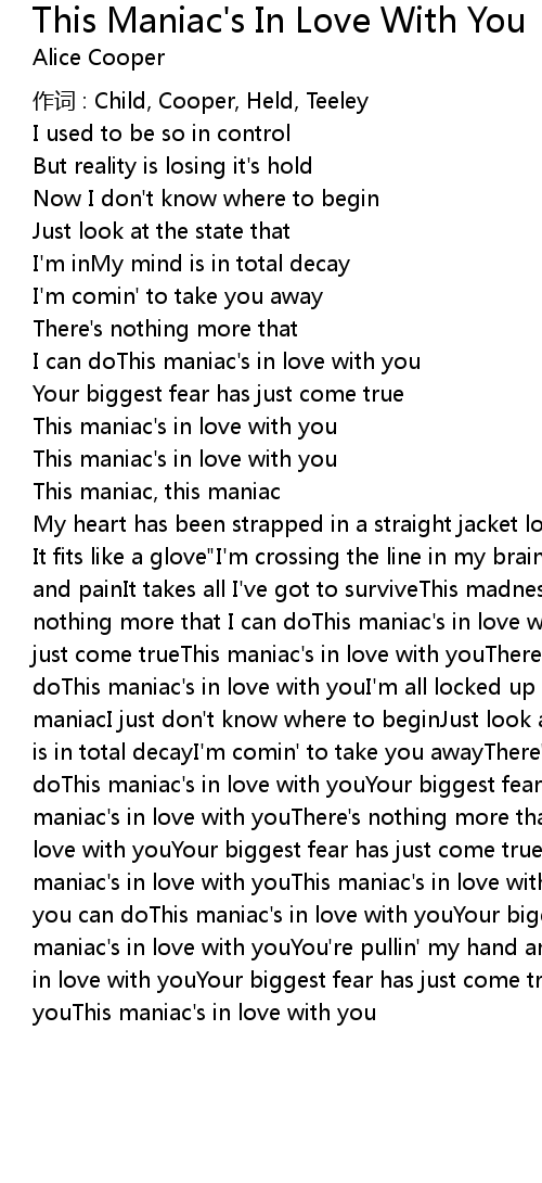 | It fits like a glove" I' m crossing the line in my brainThe line between pleasure and painIt takes all I' ve got to surviveThis madness will eat me aliveThere' s nothing more that I can doThis maniac' s in love with youYour biggest fear has just come trueThis maniac' s in love with youThere' s nothing more that I can doThis maniac' s in love with youI' m all locked up inside of youThis maniac, this maniacI just don' t know where to beginJust look at the state that I' m inMy mind is in total decayI' m comin' to take you awayThere' s nothing more that you can doThis maniac' s in love with youYour biggest fear has just come trueThis maniac' s in love with youThere' s nothing more that you can doThis maniac' s in love with youYour biggest fear has just come trueThis maniac, this maniacThis maniac' s in love with youThis maniac' s in love with youThere' s nothing more that you can doThis maniac' s in love with youYour biggest fear has just come trueThis maniac' s in love with youYou' re pullin' my hand and I' m fallin' toThis maniac' s in love with youYour biggest fear has just come trueThis maniac' s in love with youThis maniac' s in love with you |