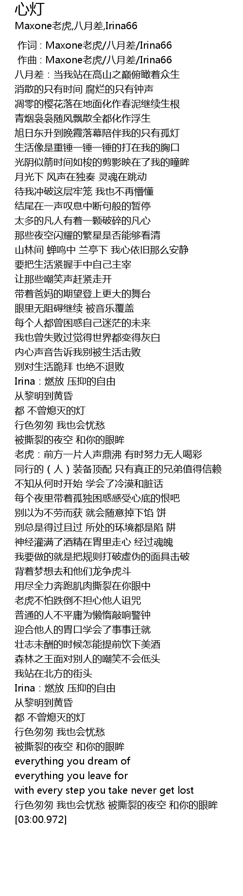 | [00:00.000] | 作词 : Maxone老虎/八月差/Irina66 |