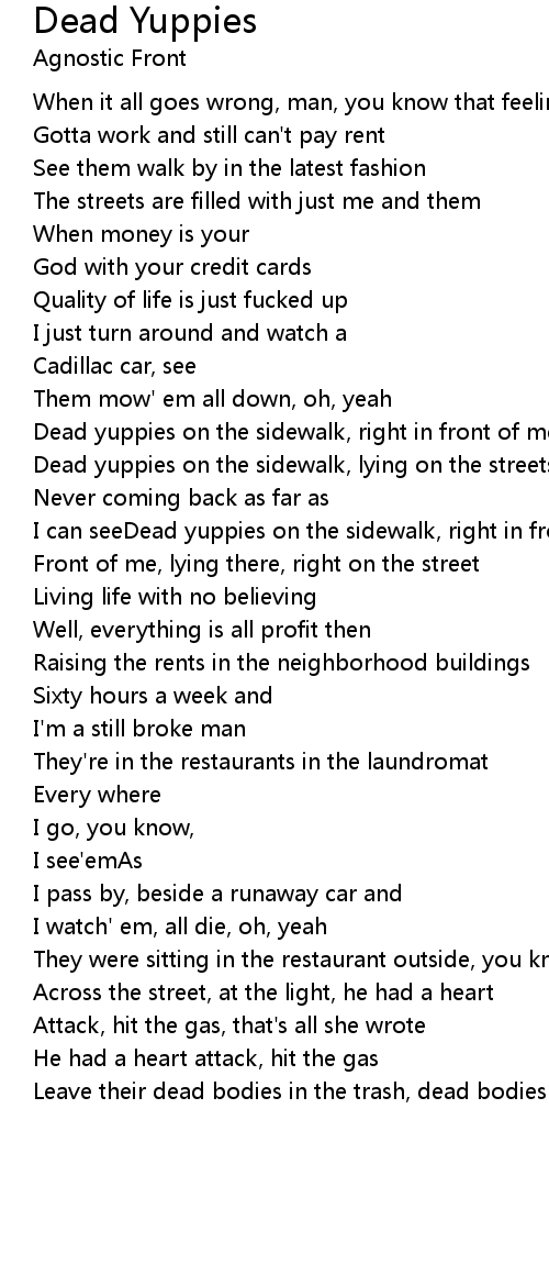 I can seeDead yuppies on the sidewalk, right in front of me |