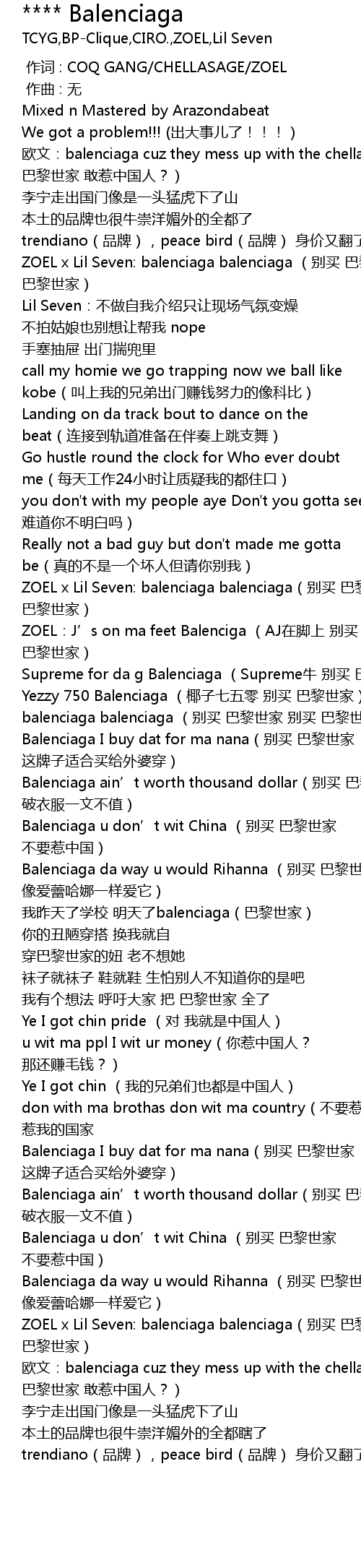 | [00:15.195] | ou wen: balenciaga cuz they mess up with the chellas bie mai ba li shi jia gan re zhong guo ren? |