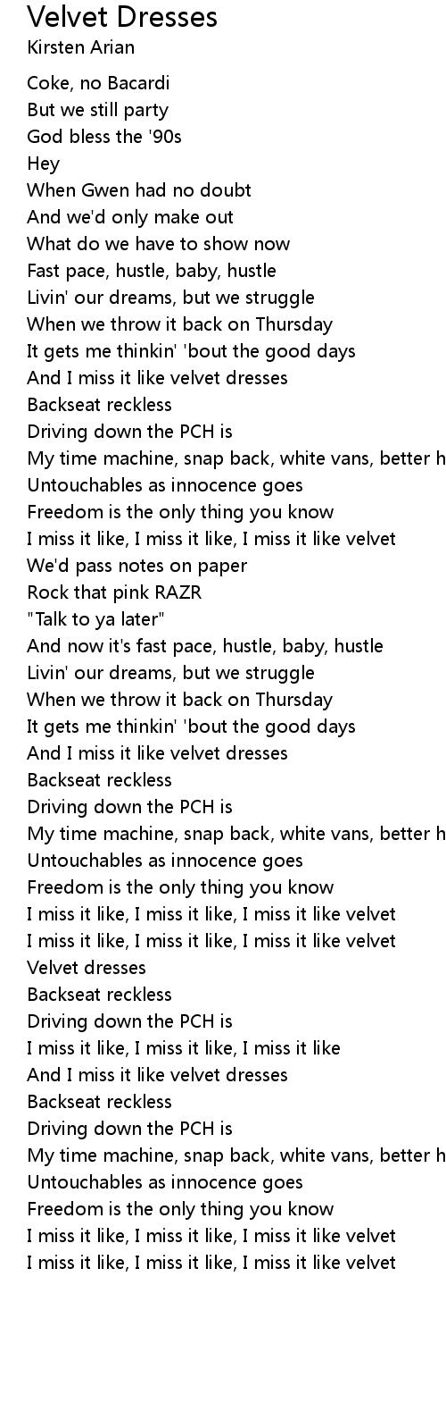 And I miss it like velvet dresses |