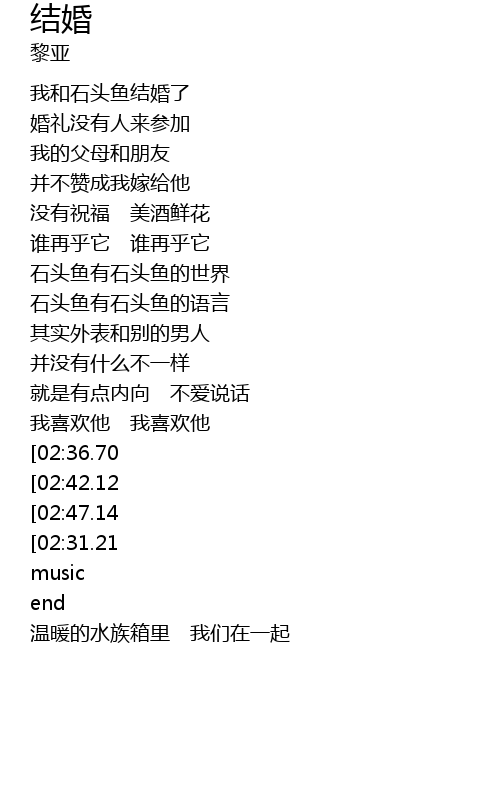 | [00:14.73] | 我和石头鱼结婚了 |