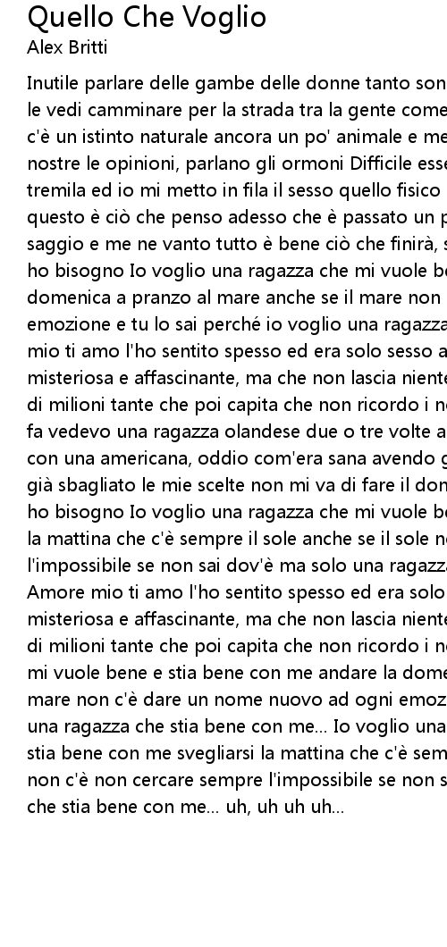 | le vedi camminare per la strada tra la gente come fosse niente però nell' uomo c'è un istinto naturale ancora un po' animale e mentre ci illudiamo siano nostre le opinioni, parlano gli ormoni Difficile essere uomo alle soglie del tremila ed io mi metto in fila il sesso quello fisico ormai non ha più senso e questo è ciò che penso adesso che è passato un po' tempo adesso son più saggio e me ne vanto tutto è bene ciò che finirà, se mi va, adesso so di cosa ho bisogno Io voglio una ragazza che mi vuole bene e stia bene con me andare la domenica a pranzo al mare anche se il mare non c'è dare un nome nuovo ad ogni emozione e tu lo sai perché io voglio una ragazza che stia bene con me... Amore mio ti amo l' ho sentito spesso ed era solo sesso attratto da una forza misteriosa e affascinante, ma che non lascia niente le storie sono tante milioni di milioni tante che poi capita che non ricordo i nomi uh, uh uh uh... Un anno fa vedevo una ragazza olandese due o tre volte al mese andavo a far ginnastica con una americana, oddio com' era sana avendo già provato mille volte avendo già sbagliato le mie scelte non mi va di fare il dongiovanni adesso so di cosa ho bisogno Io voglio una ragazza che mi vuole bene e stia bene con me svegliarsi la mattina che c'è sempre il sole anche se il sole non c'è non cercare sempre l' impossibile se non sai dov'è ma solo una ragazza che stia bene con me... Amore mio ti amo l' ho sentito spesso ed era solo sesso attratto da una forza misteriosa e affascinante, ma che non lascia niente le storie sono tante milioni di milioni tante che poi capita che non ricordo i nomi Io voglio una ragazza che mi vuole bene e stia bene con me andare la domenica a pranzo al mare anche se il mare non c'è dare un nome nuovo ad ogni emozione e tu lo sai perché io voglio una ragazza che stia bene con me... Io voglio una ragazza che mi vuole bene e stia bene con me svegliarsi la mattina che c'è sempre il sole anche se il sole non c'è non cercare sempre l' impossibile se non sai dov'è ma solo una ragazza che stia bene con me... uh, uh uh uh... |