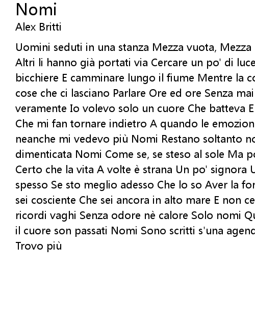 | Uomini seduti in una stanza Mezza vuota, Mezza chiusa Certi quadri ancora appesi Altri li hanno gia portati via Cercare un po' di luce Dentro il fondo di un bicchiere E camminare lungo il fiume Mentre la corrente va di testa sua Quante cose che ci lasciano Parlare Ore ed ore Senza mai capire Senza mai parlare veramente Io volevo solo un cuore Che batteva E non chiedeva Tutte quelle cose Che mi fan tornare indietro A quando le emozioni Mi coprivano talmente Che neanche mi vedevo piu Nomi Restano soltanto nomi Sparsi su una agenda Gia dimenticata Nomi Come se, se steso al sole Ma poi piove e non ti scalda piu Certo che la vita A volte e strana Un po' signora Un po' ruffiana E mi domando spesso Se sto meglio adesso Che lo so Aver la forza di ricominciare Anche quando sei cosciente Che sei ancora in alto mare E non ce la fai piu Nomi Restano ricordi vaghi Senza odore ne calore Solo nomi Quanti nomi nella testa E dentro il cuore son passati Nomi Sono scritti s' una agenda Che ho cercato E che neanche Trovo piu |