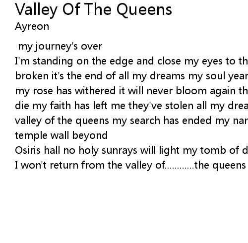 I'm standing on the edge and close my eyes to this world of lies my will is broken it's the end of all my dreams my soul yearns for the valley of the queens my rose has withered it will never bloom again the soil is dry time has come to die my faith has left me they've stolen all my dreams oh lay me down in the valley of the queens my search has ended my name is carved in stone on the temple wall beyond |