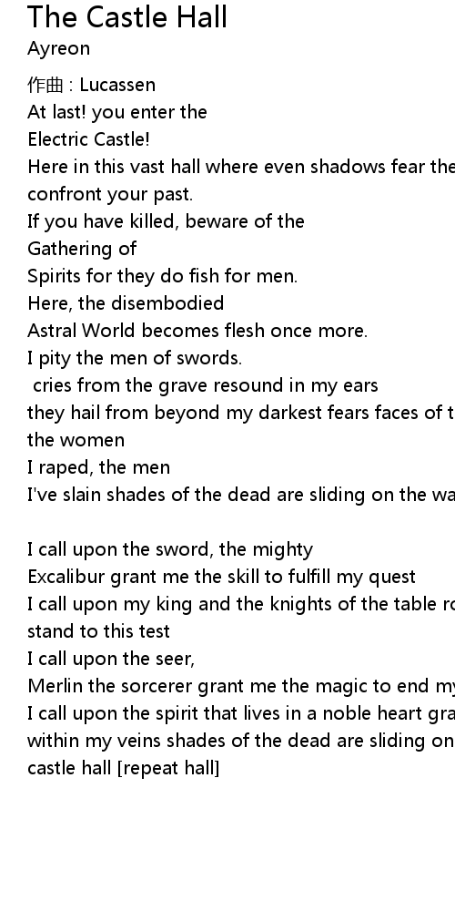 | I call upon the spirit that lives in a noble heart grant me the passion that' s within my veins shades of the dead are sliding on the wall demons dance in the castle hall repeat hall |