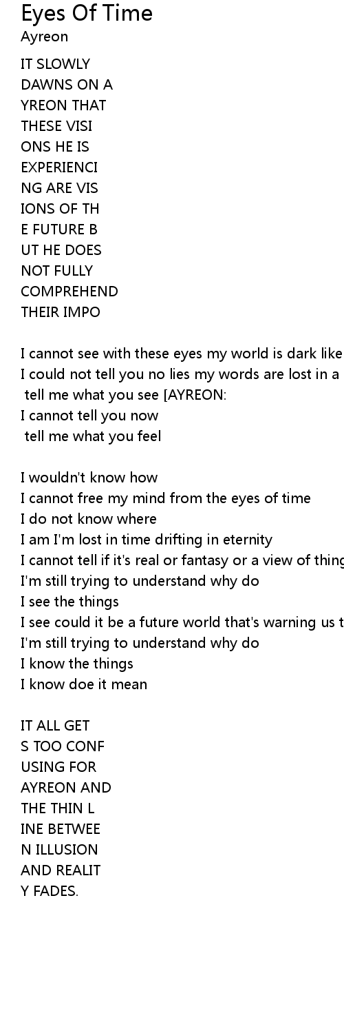 I see the world through the eyes of time [VILLAGERS:] tell me what you feel [AYREON:] |