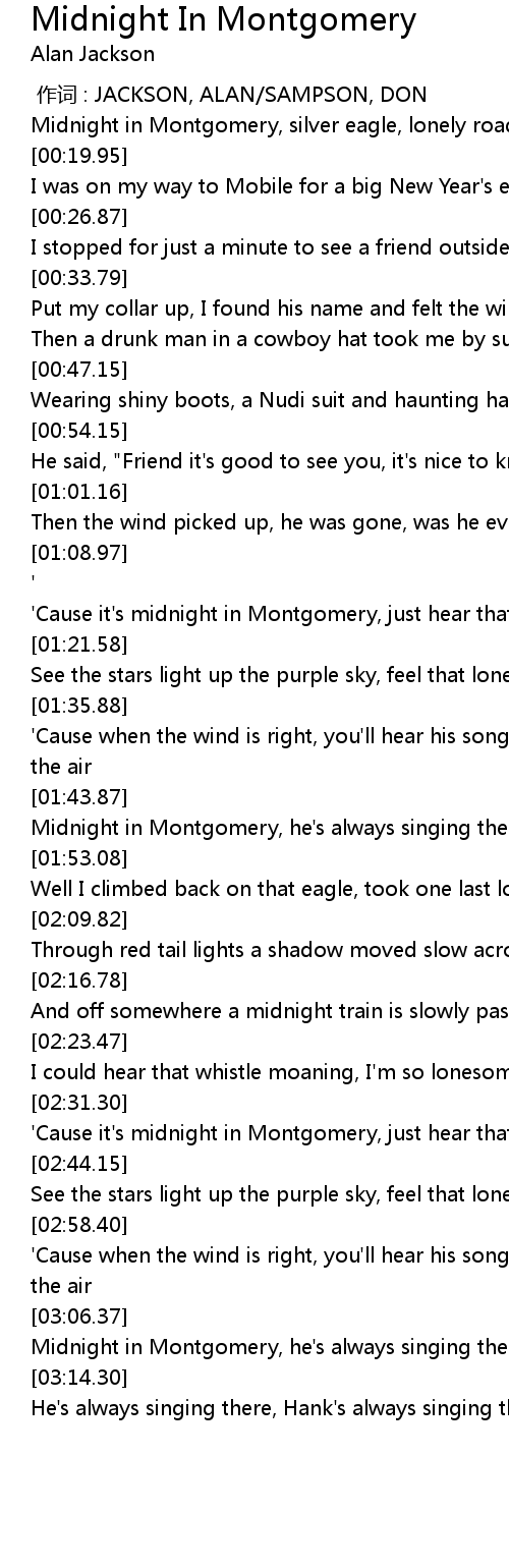 | [00:14.36] | Midnight in Montgomery, silver eagle, lonely road |