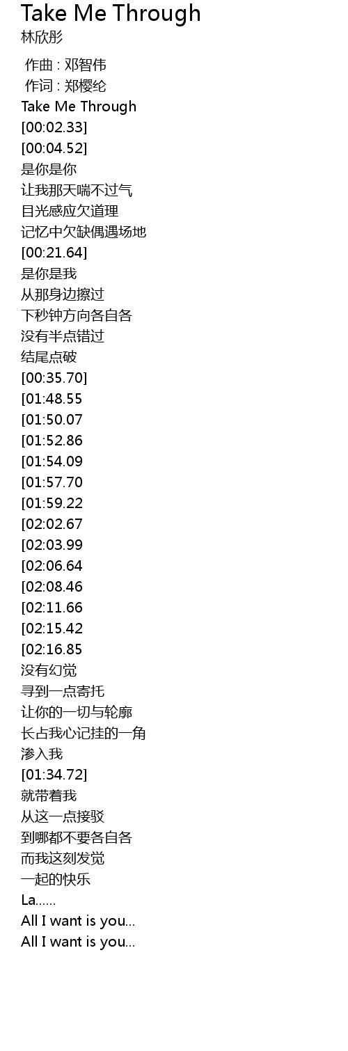 | [02:49.78][01:52.86][00:40.63] | Take me through |