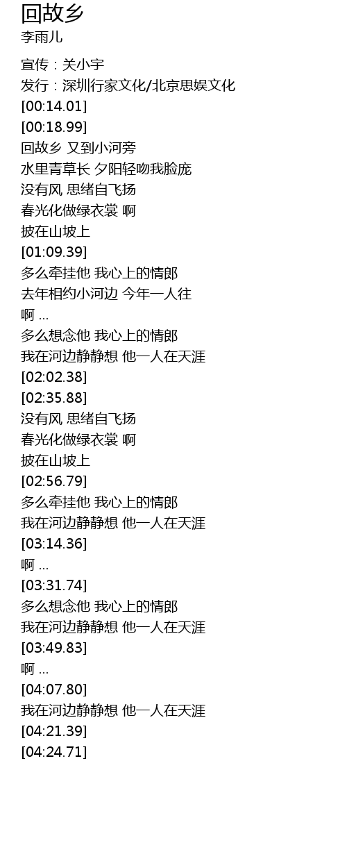 | [04:08.77] | 我在河边静静想 他一人在天涯 |