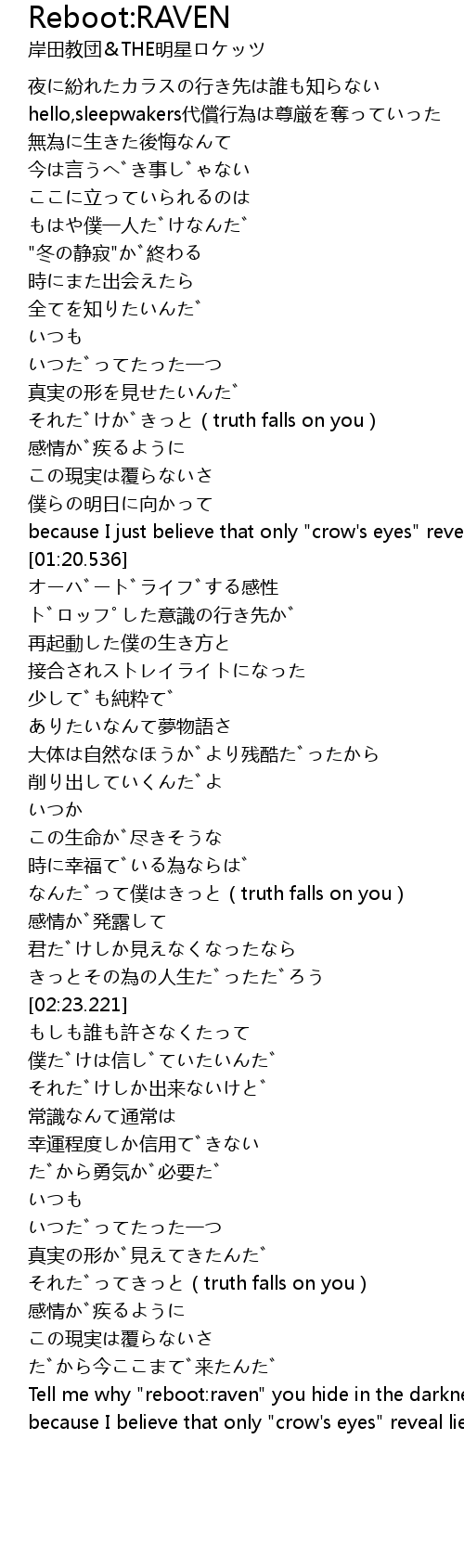 | [03:17.659] | Tell me why "reboot:raven" you hide in the darkness |