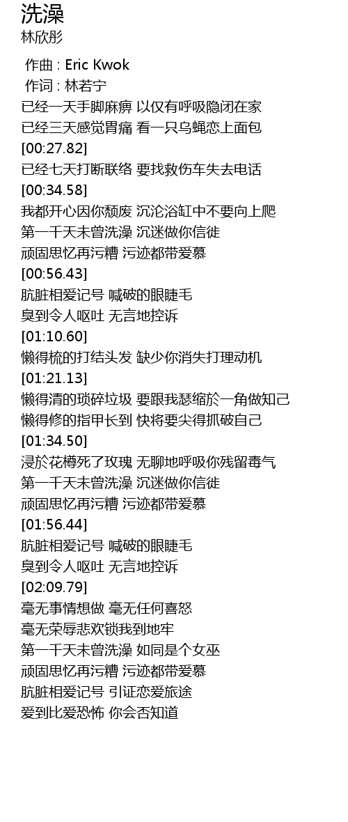 | [00:42.79] | 第一千天未曾洗澡 沉迷做你信徙 |