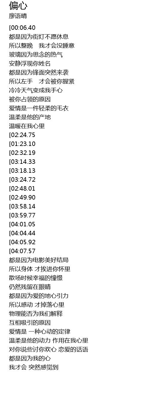 | [01:09.98][01:23.10][02:28.88][02:42.17][03:08.93][03:21.40][03:34.57][03:47.74] | 已经偏心爱上你 |