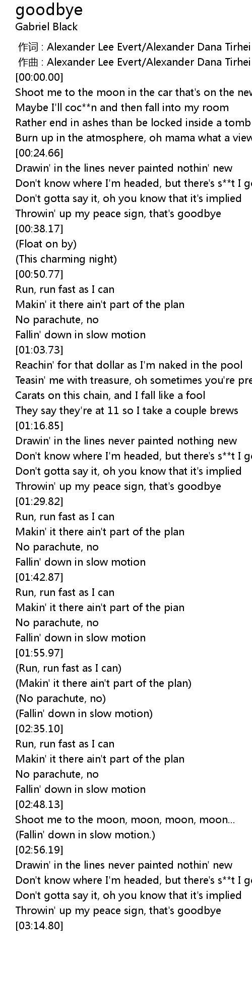 | [03:04.64] | Don't know where I'm headed, but there's s**t I gotta do |